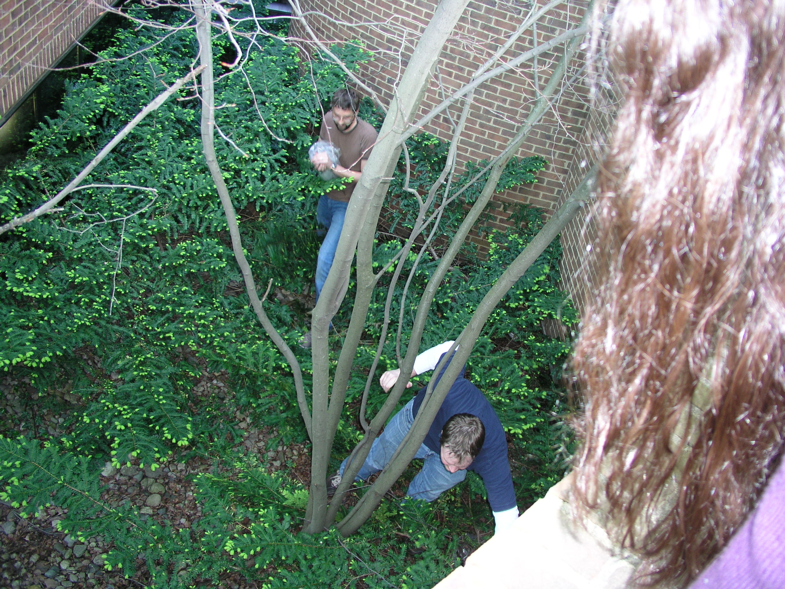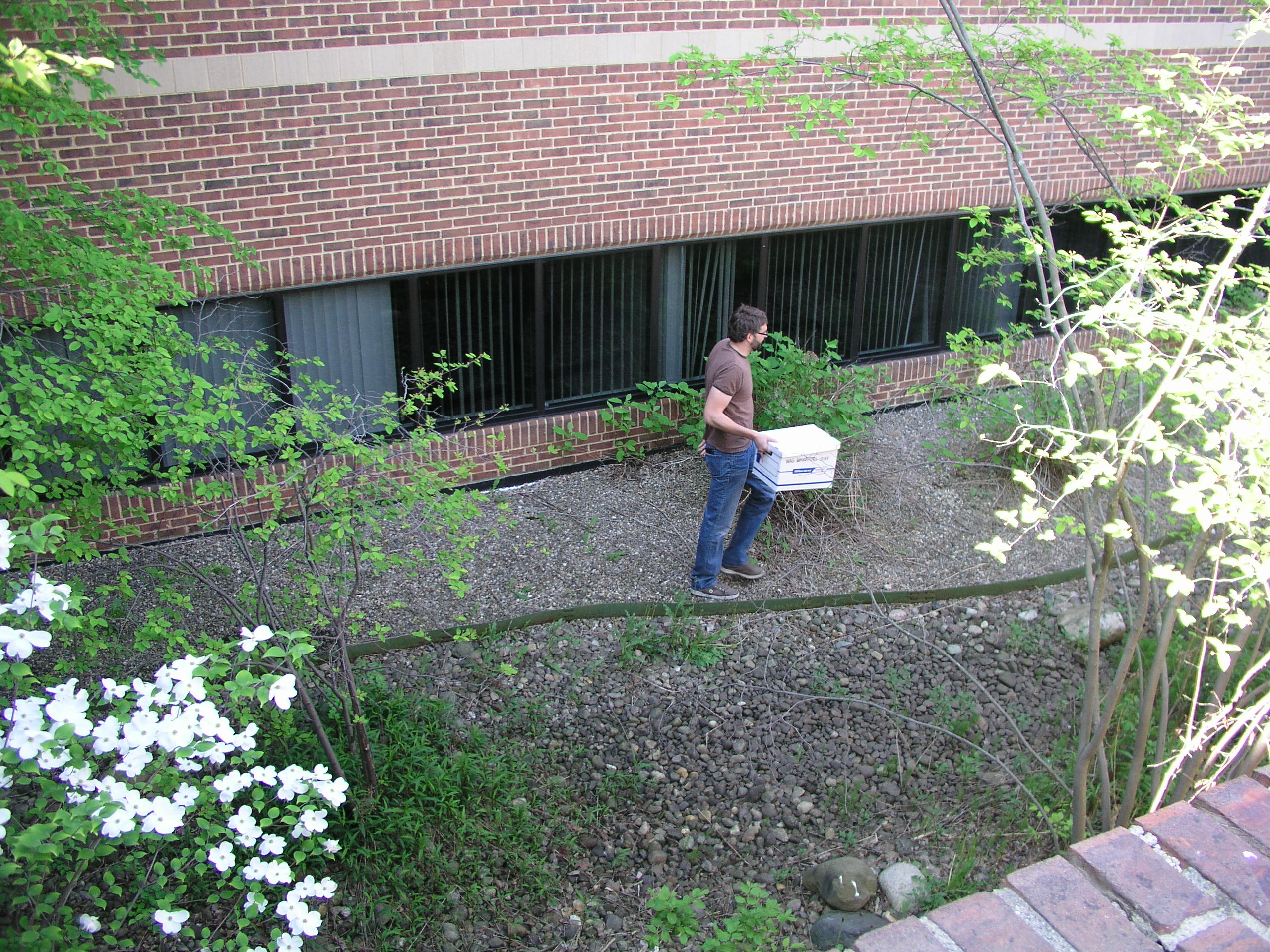 I called Josh to help. He grumbled something about survival of the fittest and what a dumb duck to build a nest in a pit. I said something like, “Don’t make me tell Eleanor on you!” Suddenly Josh had arrived to help. Then another guy who was in his office watching, decided to help, too. That’s me looking down and directing them. Baby ducks are skedaddlers! I had to say things like, “Quick!  It went that way!” I was helpful.