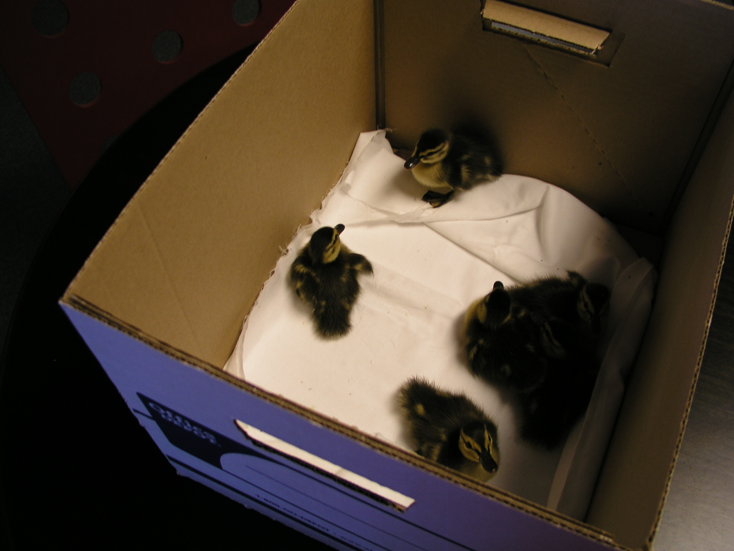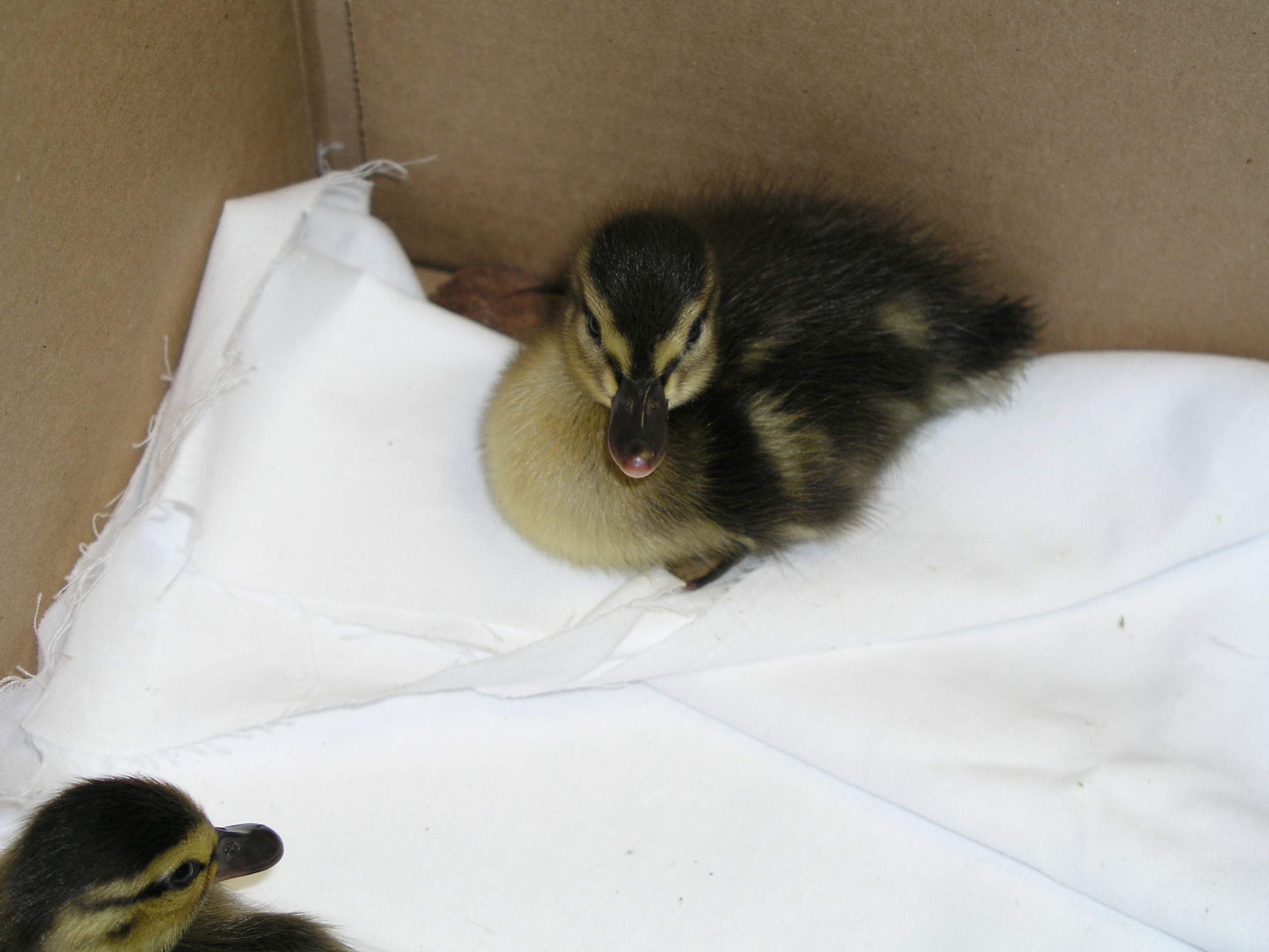 I called the Humane Society who transferred me to a water fowl rehab-ber. She said, “You’ll have to go down there put the babies in a box, and then bring them to me.”